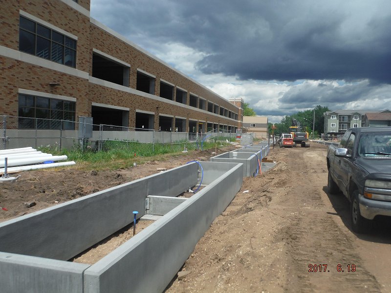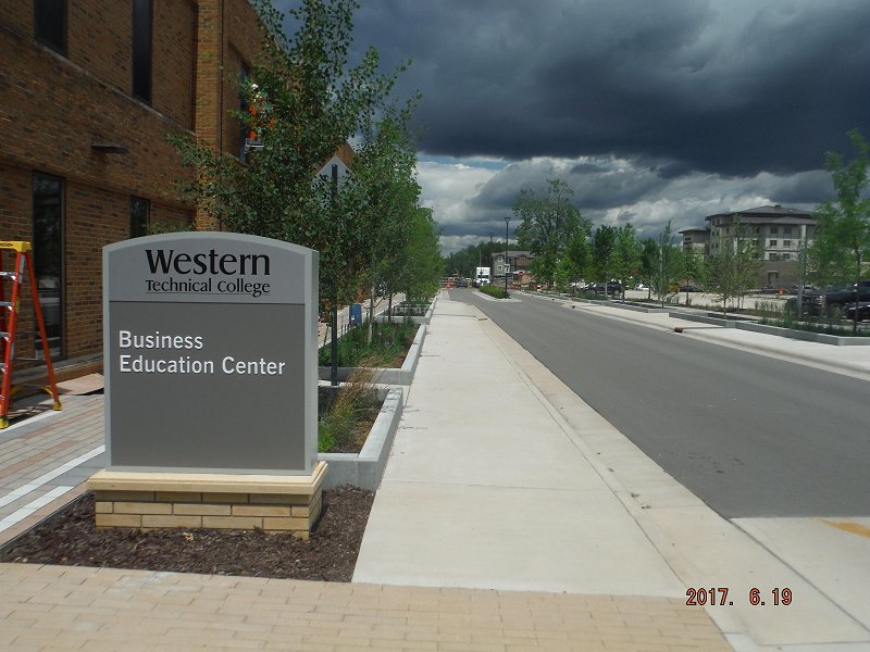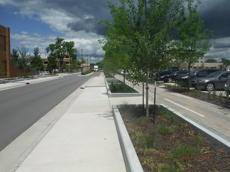 These are storm water planters installed at Western Technical College in La Crosse, WI. Crest Precast contracted phase one for 22 planters and 6 curved precast benches with Skate Stoppers™. in 2016 and 24 planters in 2017. These planters take 100 percent of parking lot rain water and return water to the soil.