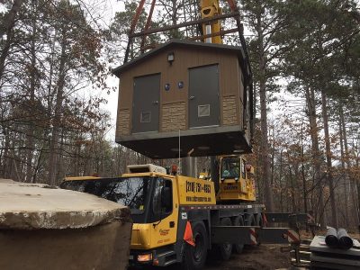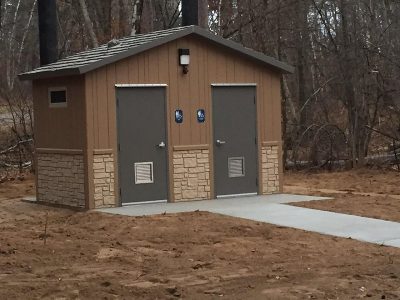 Precast Concrete restroom placed near Pequot Lakes, MN for the Corp of Engineers at the Clamshell Landing. Crest Precast Concrete was the general contractor on this project and included removal of existing structures, excavation, placement with crane and precast walkways, The structure will have solar vents and lighting.