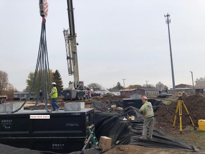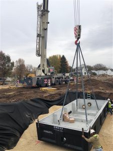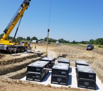 Precast septic tank set in Columbia, MO for large sewer project. Crest Precast placed 6 each Model 5,000 gallon tanks for American Outdoor Brands at their new 55 million dollar distribution center. BIO-GARD will outfit the tanks as Septic, Re-circulation and Pump tanks. The piping lined up perfectly for this complex tank set.